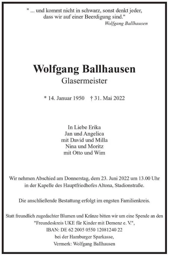 Am 31.5.2022 verstarb unser Gründer Wolfgang Ballhausen.